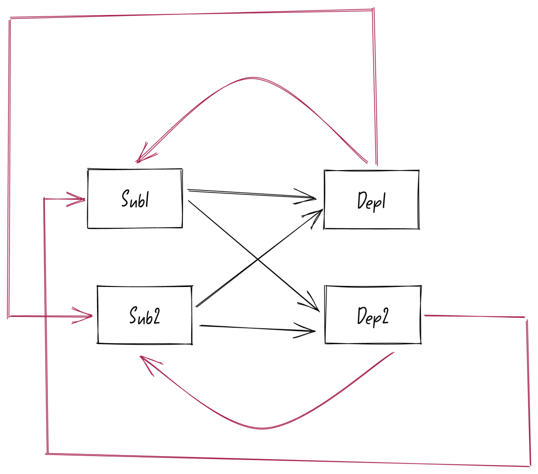 首先从上图中可以看到 Sub 订阅者和 Dep 依赖之间没有任何直接的连接关系了,也就是说 Sub 订阅者不能直接访问到 Dep 依赖,Dep 依赖也不能直接访问 Sub 订阅者。
