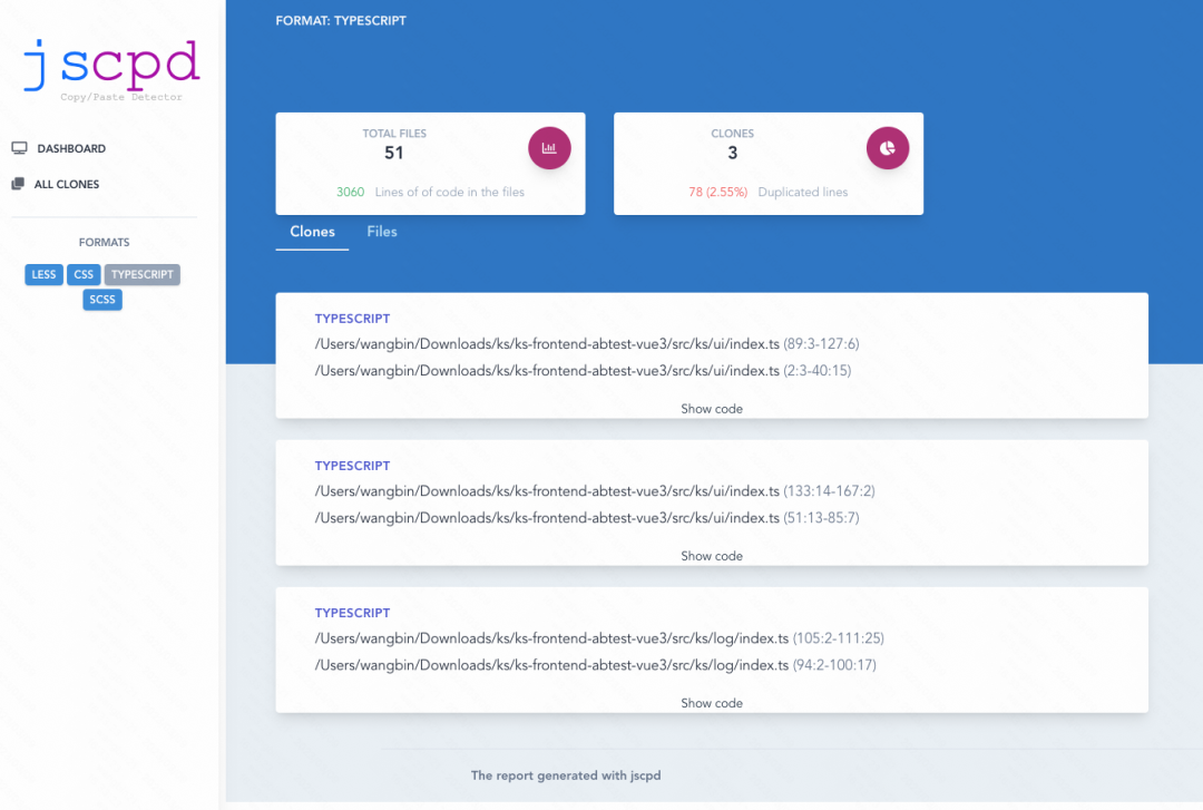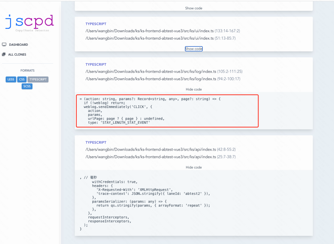 - 通过 jscpd 检查代码重复率,基于视图分析出需要优化的代码,如下图可以看出文件中重复的代码