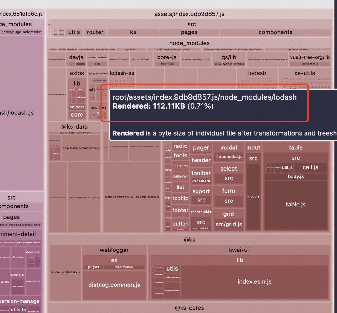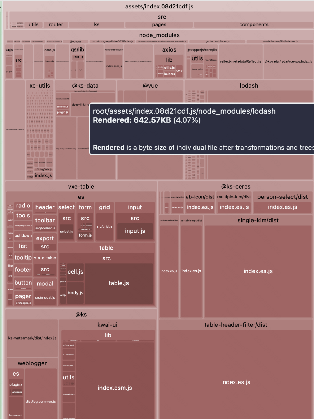 从图中可以看到 highlight.js 下将所有的语言包都引入了,引入了 loadash 下所有的工具包,另外 echarts 等包重复打包,问题总结如下: