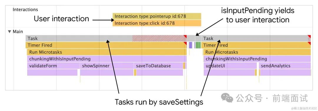 用户输入后isInputPending的返回值不一定总是 “true”, 这是因为操作系统需要时间来通知浏览器交互结束,也就是说其他代码可能已经开始执行,比如截图例子中的saveToDatabase这个方法可能已经在执行了。即便使用isInputPending,还是需要在每个方法限制任务中的方法数量。