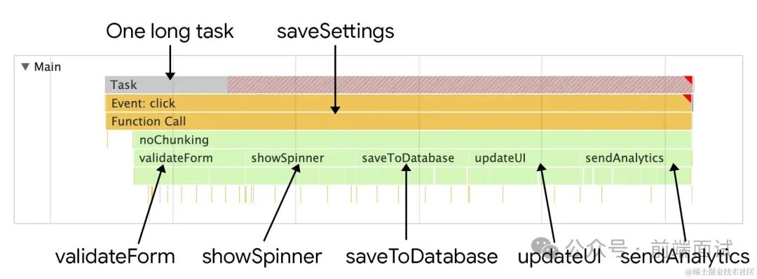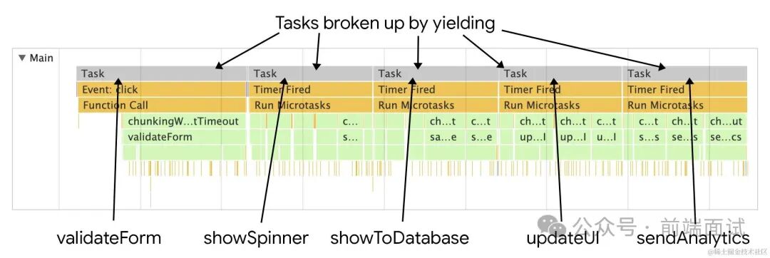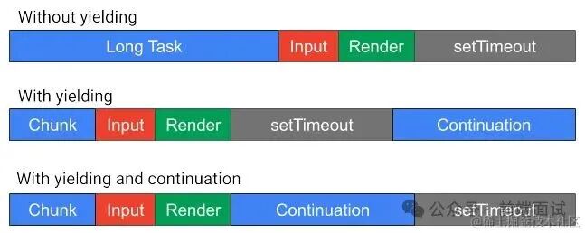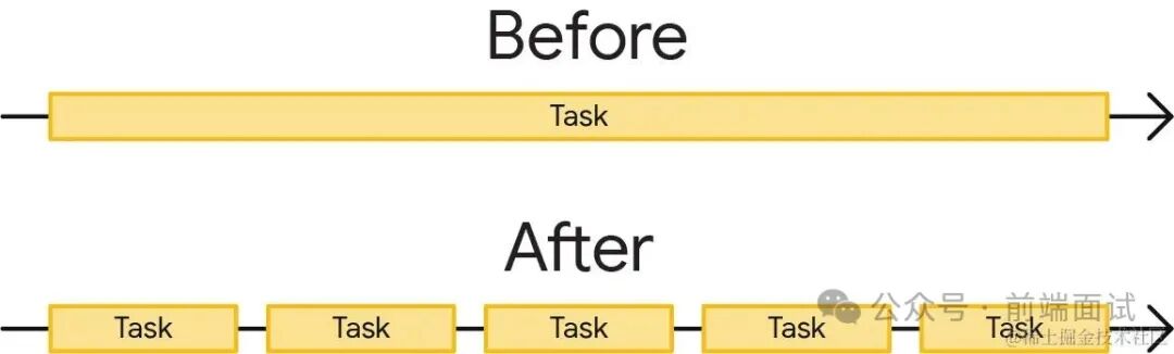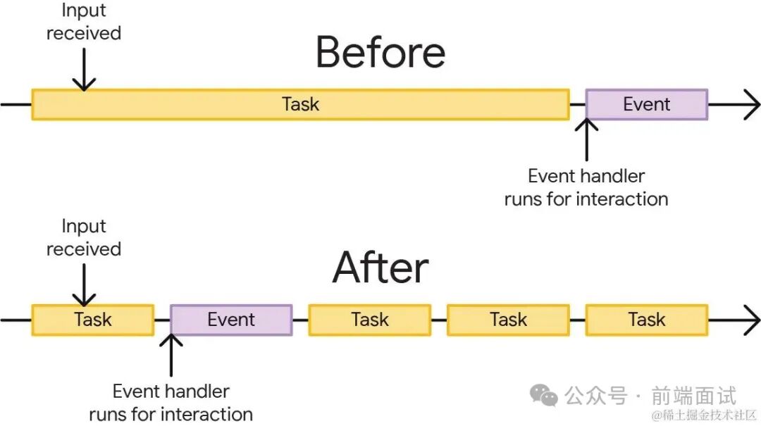 因为_长任务_的缘故,用户交互产生的事件处理就必须排队,等待长任务执行完后才能执行。这个时候就会导致用户交互的_延迟_。当拆分成较短的任务后,事件处理器就有机会更快的触发。 因为事件处理器能够在短任务之间得以执行,也就比长任务耗时更短。在长耗时的图片中,用户可能就会感到_卡顿_;长任务拆分后,用户可能就感觉体验很_流畅_。