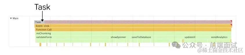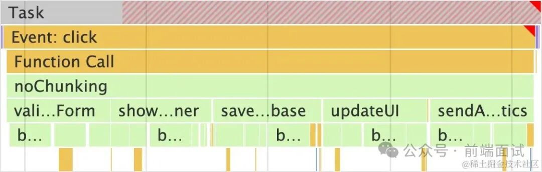 如果任务非常长,浏览器对用户交互的展示如图所示,这时候浏览器就没法_快速_处理用户交互,但拆分长任务后的从图中能看到效果就不一样。