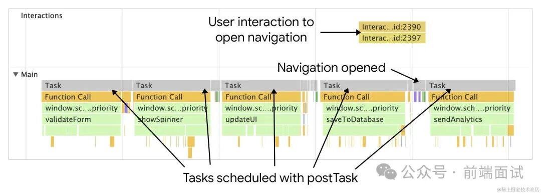 function saveSettings () {// Validate the form at high priority scheduler.postTask(validateForm, {priority: 'user-blocking'});// Show the spinner at high priority: scheduler.postTask(showSpinner, {priority: 'user-blocking'});// Update the database in the background: scheduler.postTask(saveToDatabase, {priority: 'background'});// Update the user interface at high priority: scheduler.postTask(updateUI, {priority: 'user-blocking'});// Send analytics data in the background: scheduler.postTask(sendAnalytics, {priority: 'background'});};在上面例子中,通过这些任务的优先级的编排方式,能让高浏览器级别的任务,比如用户交互等得以触发。
