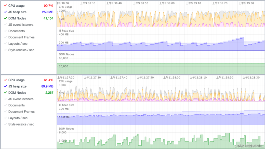 没有做上述「「2 / 3 / 4」」步骤点优化时,页面的 DOM 节点数量在 40000+,由于页面的 DOM 节点较多,所以当用户和页面发生交互行为时,CPU 的占用率在 90% 以上,JS 的内存体积也在 250M+,进而导致页面卡顿明显。优化之后,可以将页面上的 DOM 节点数控制在 6000 以下,此时当用户和页面交互时,CPU 的占用率在 50% 左右,JS 的内存体积在 100M 以下,因此页面交互会流畅很多!😈