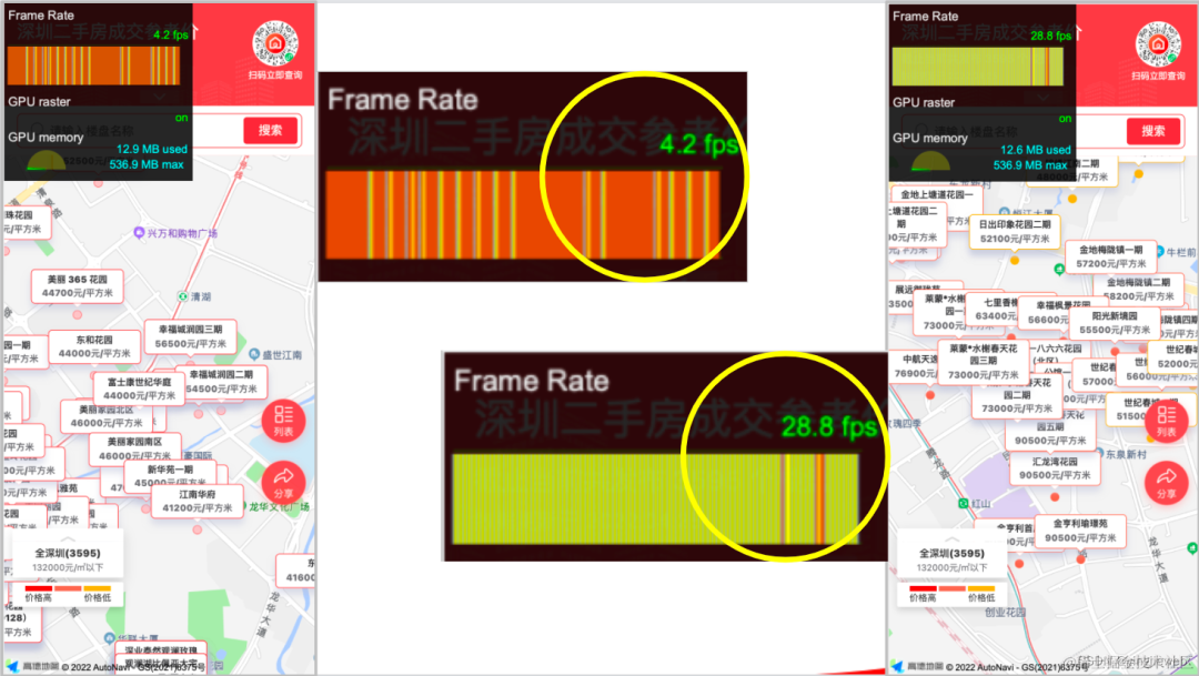 2 「、帧率统计对比」:这也是对上述「「2、针对海量标注的分片加载优化」」的优化验证,通过只展示屏内的标注,可以大大缩减海量标注的数量,进而在用户和页面发生交互行为时,页面的响应速度会更快、帧率更高,对比图如下: