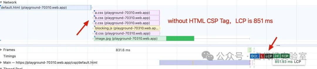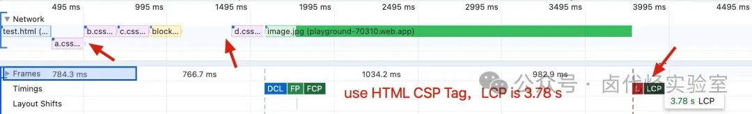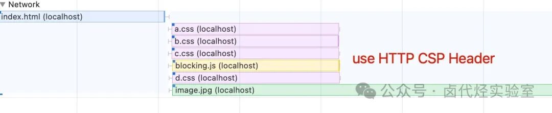 加上 HTML CSP meta Tag,并行下载全都变成了串行加载,首屏性能大大劣化: