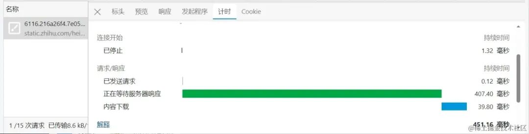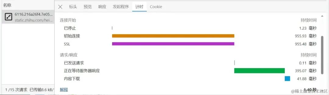| 开发者工具计时截图 | 在 DevTool - Network - 资源 - 计时(Timing)面板中可以看到,因为Preconnect && DNS-Prefetch优化生效,连接开始阶段的耗时从 950ms 降低到了 1ms,使得资源的整体加载耗时大幅减少。 | ||