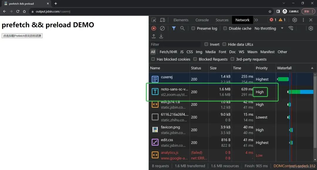 应用了preload提示的资源,通常会以较高的优先级率先在网页中加载,例如下图中的nato-sans.woff2请求,Priority列的值为High,加载顺序仅次于Document本身。