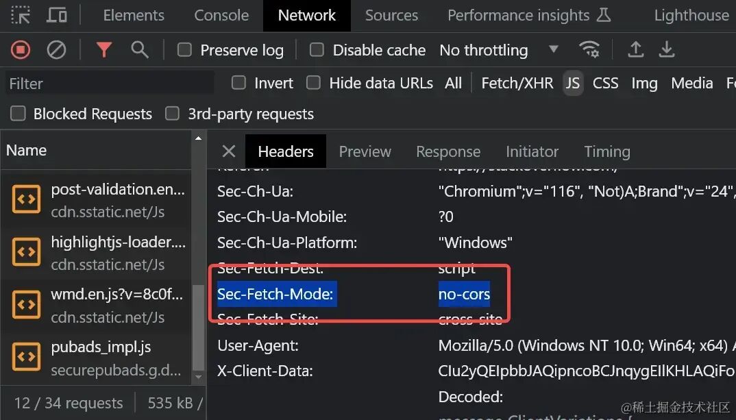 no-cors,表示当前资源加载的模式并非跨域资源共享模式。其对应的资源优先级提示不需要设置为跨域crossorigin="anonymous"。值为