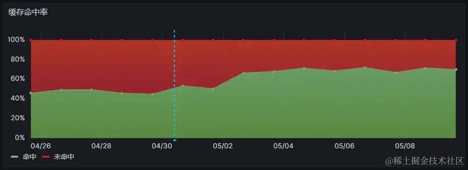 观察缓存命中率可视化图,在 4 月 30 日优化上线后,缓存命中率从优化前的约 40%,显著提升到了 70%。同样可以佐证我们的优化产生了显著的正向收益。