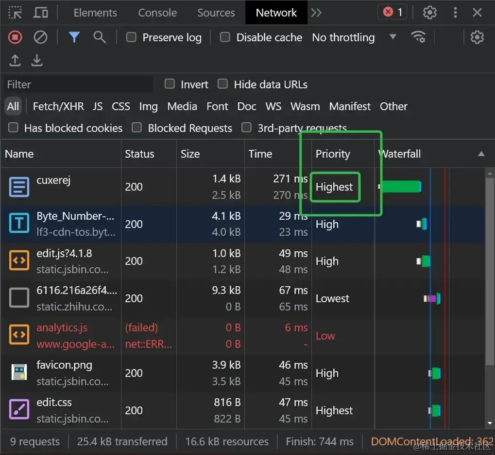 各类资源优先级提示是否生效,可以通过开发者工具中的网络 Network 面板判断。我们主要使用 优先级列(Priority),体积列(Size)和 加载时间序标签页(Timing)判断。