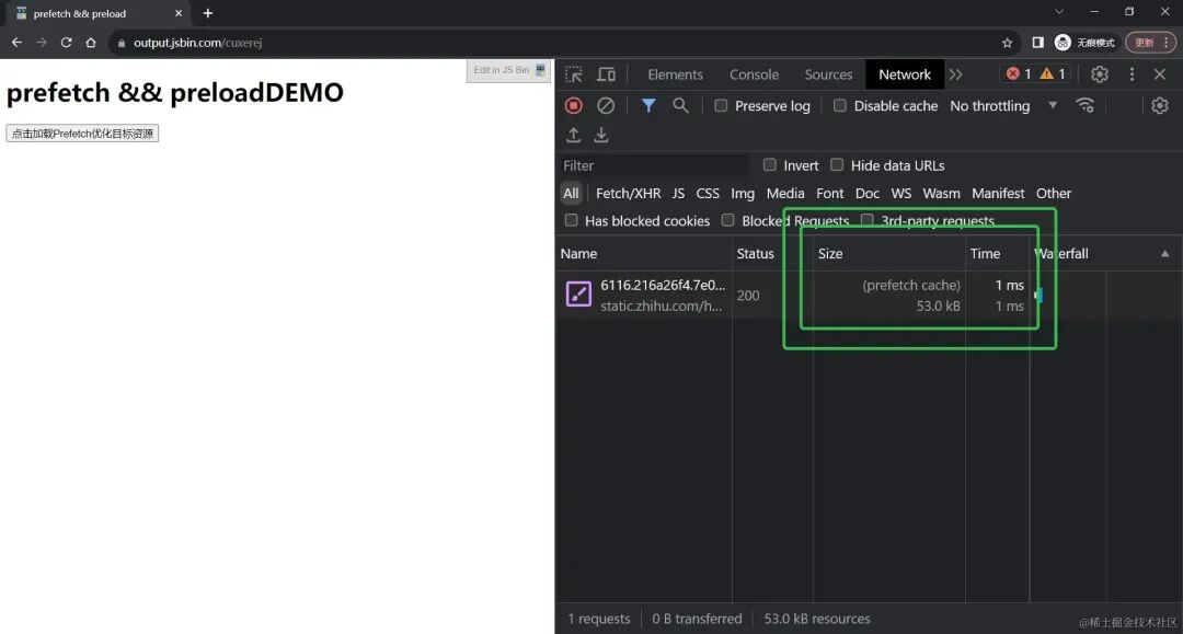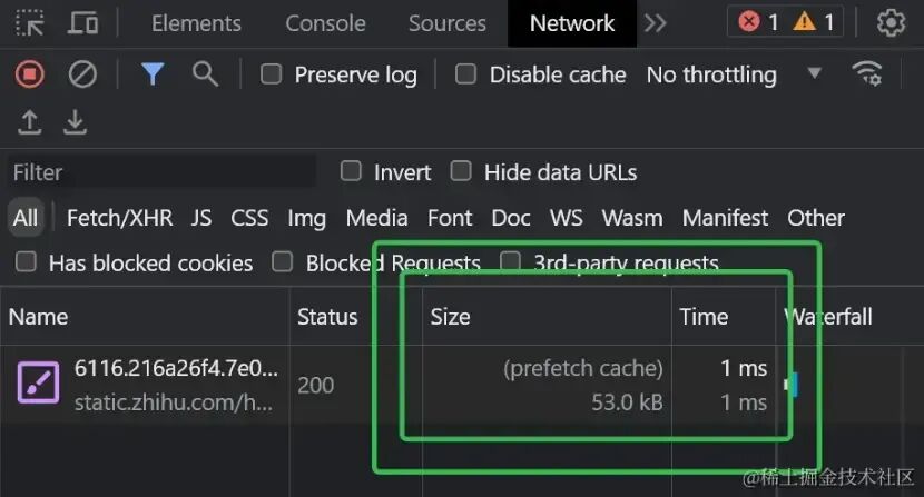 命中预取回缓存的请求,在开发者工具中的Network标签中的Size列,会有独特的(prefetch cache)标记: