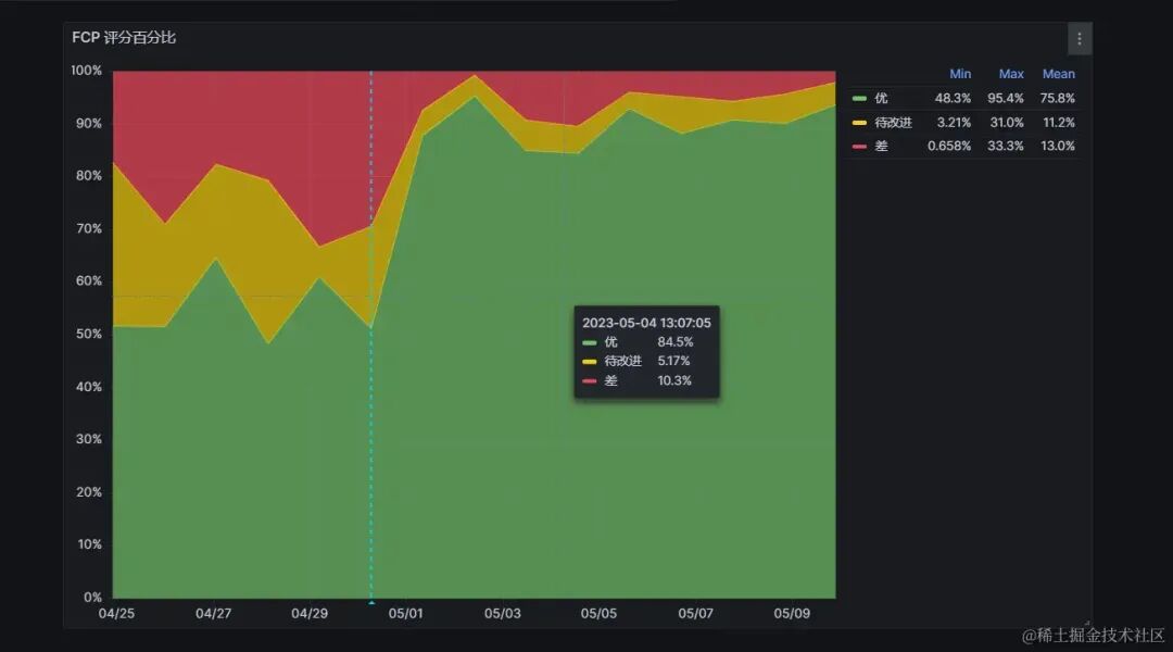 观察 FCP 的评分百分比可视化图,在 4 月 30 日优化上线后,评分为优的用户占比从优化前的约 50%,显著提升到了 90%。