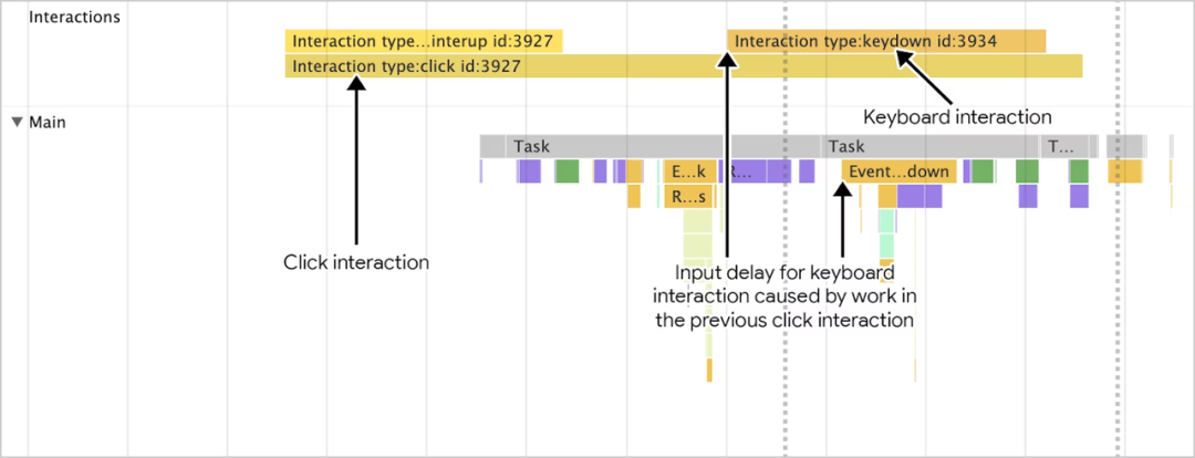 它不仅仅测量首次交互,而是所有交互延时。除了输入延时,还包括事件处理时长,渲染延时。它的目标是确保从用户开始交互到下一帧绘制的时间尽可能短,以满足用户进行的所有或大多数交互。
