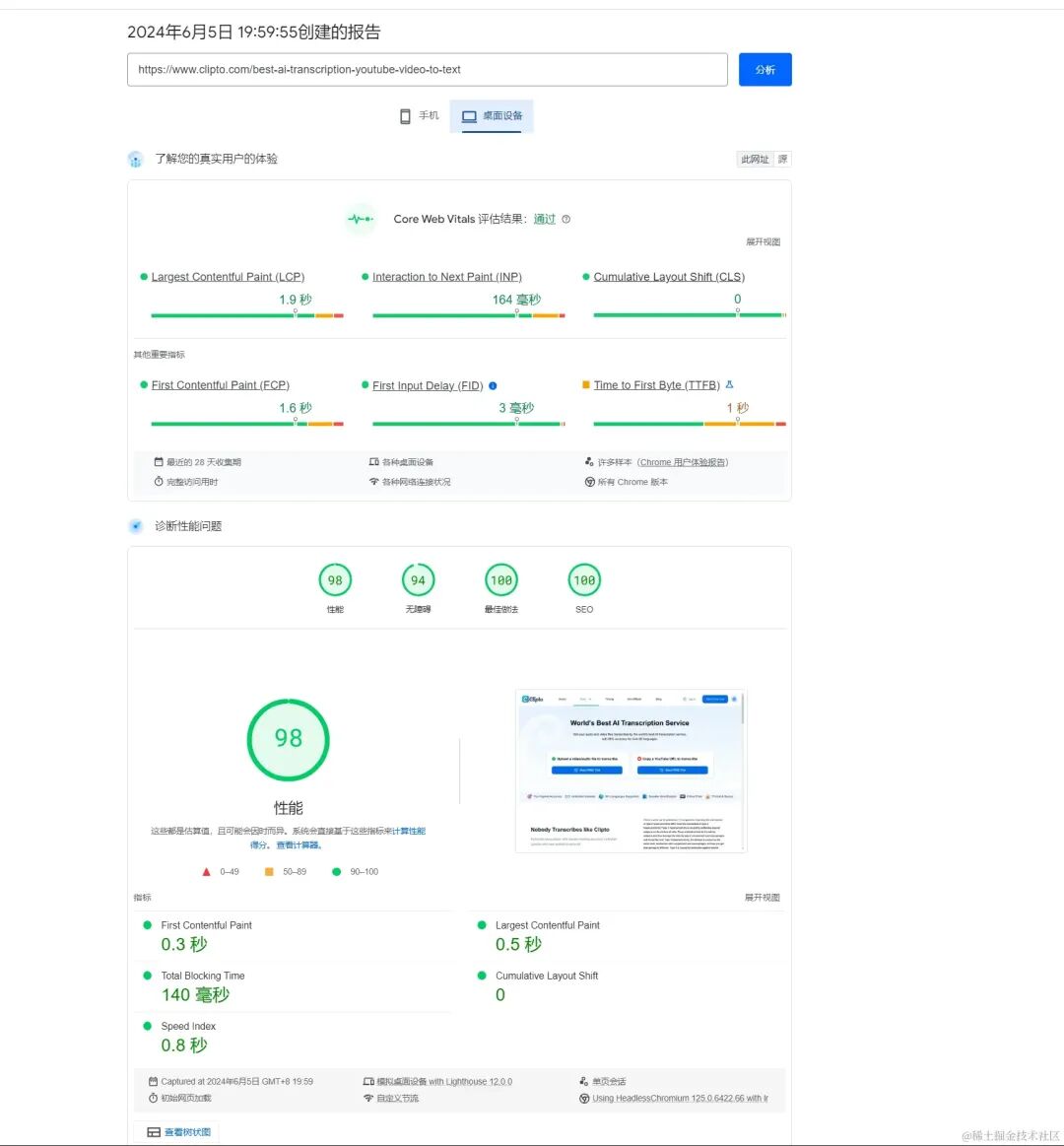 <head> {!isFrontPage && <link rel ="prefetch" href="/lib/ffmpeg-core/ffmpeg-core.wasm" as="fetch" crossOrigin="anonymous"/>}</head>........... 中间的优化 大多还是针对性对 资源大小 加载时机 进行处理 最终分数 平均在 93 最高一次达到 98 跟网络也有一定关系 欣赏结果把