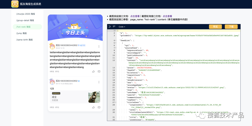 为了方便使用海报图片的开发人员,我们还配套开发了海报生成系统在线文档。开发人员可以通过该系统查看现有的海报图片以及相关参数字段,并可以通过右方的编辑器更改字段的值并实时得到新的渲染图进行预览和下载。如图 10,开发人员可以在这个playground里进行所见即所得的预览及操作。