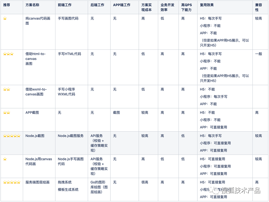 首先,我们调研了业界现有的图片渲染方案,如下表。通过下表的调研总结可以看出各个方案各有优劣势。由于复用提效是重要需求点,我们把方案锁定了服务端渲染方向上,即入选方案为: