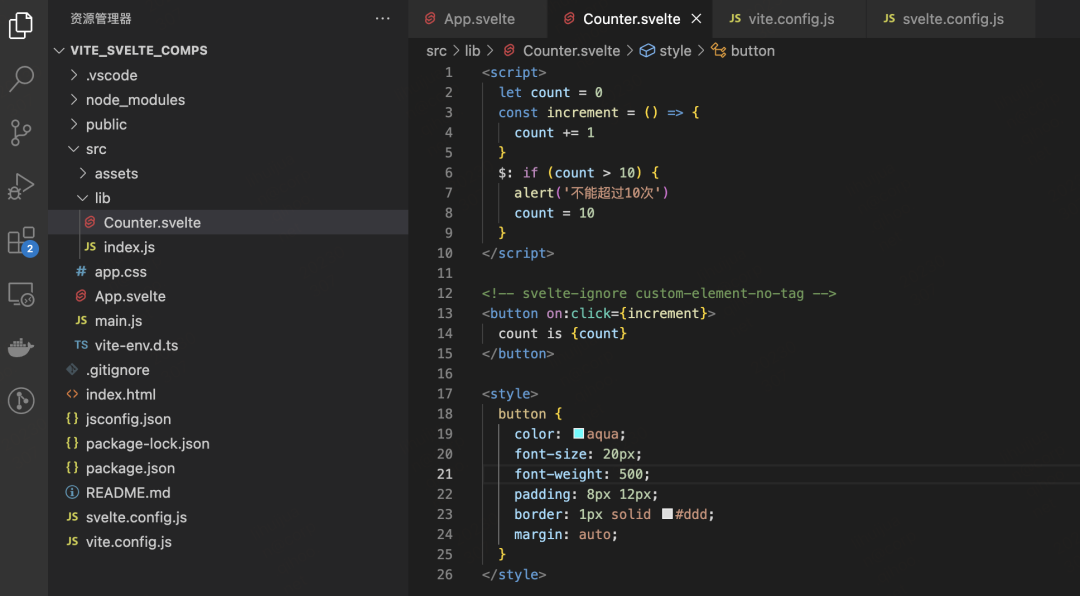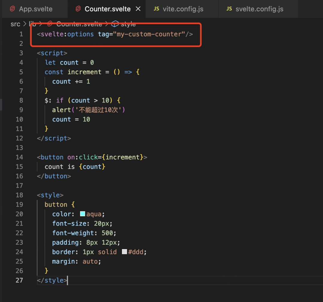 然后在组件内定义元素名称<svelte:options tag="my-custom-counter"/>