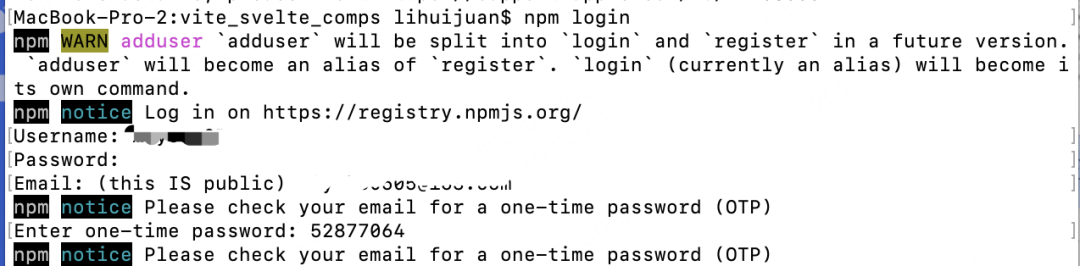2、注册成功后,在终端登录 npm 账号 npm login (登录 npm 账号,密码,邮箱验证)