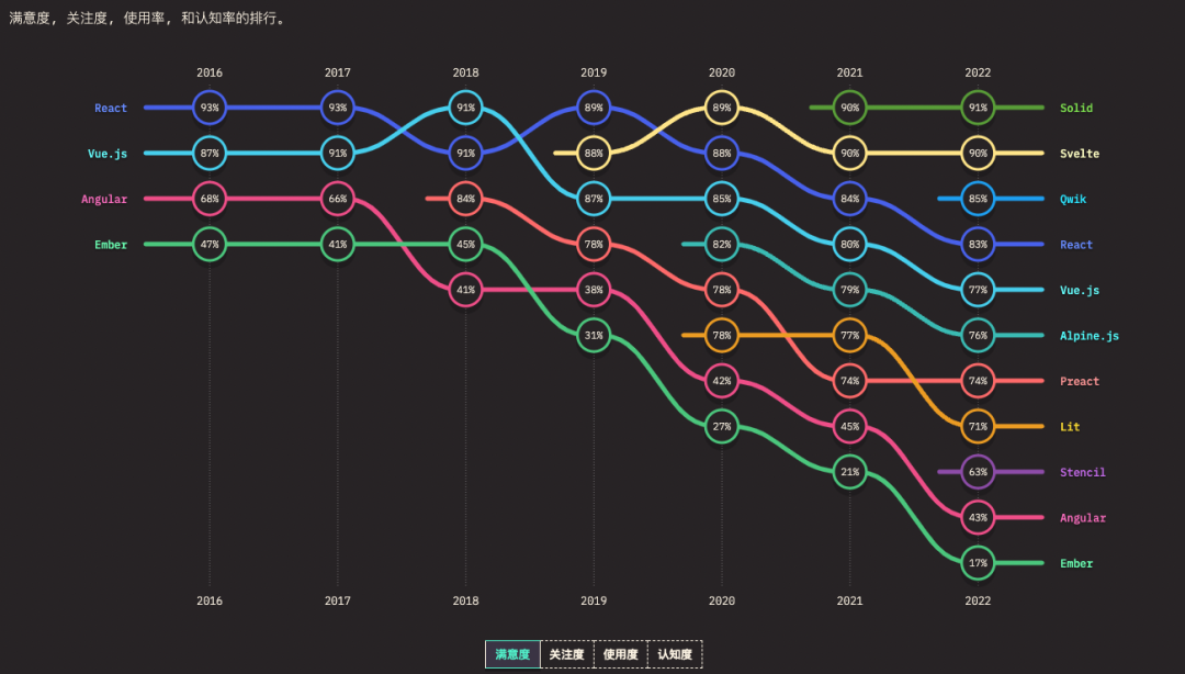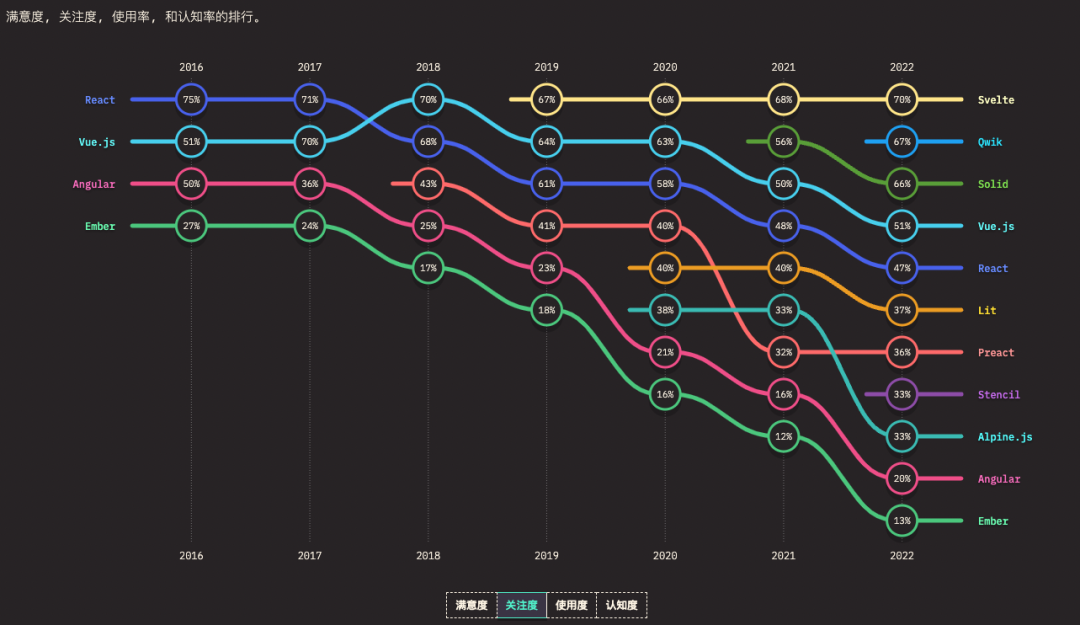 前端框架的满意度 & 关注度走势