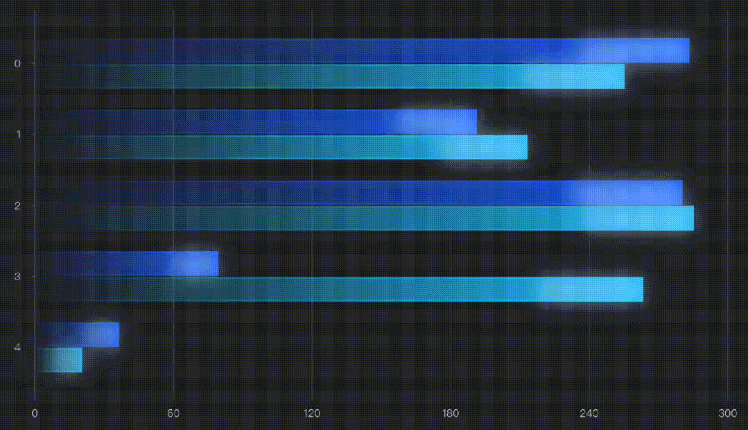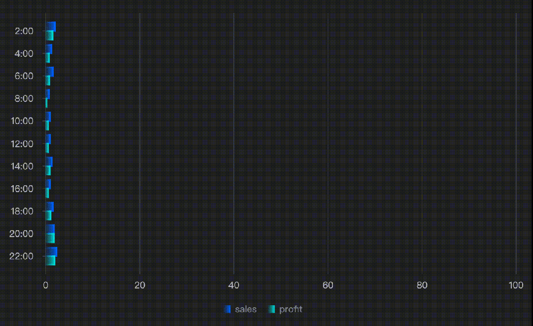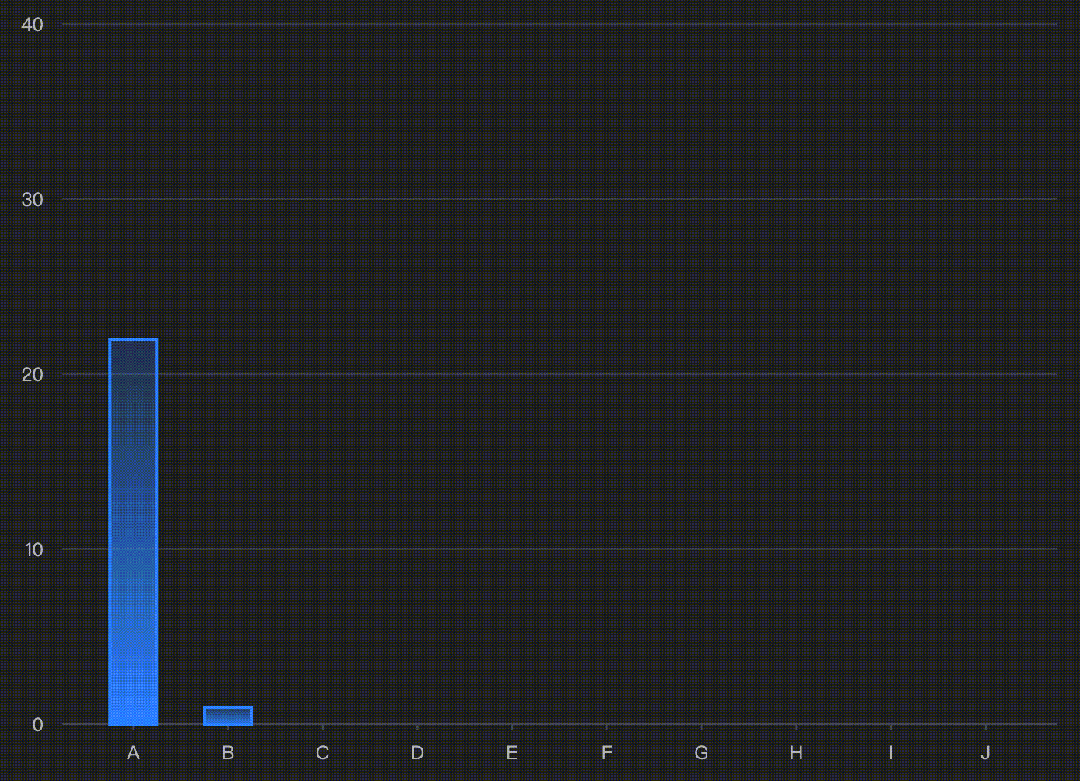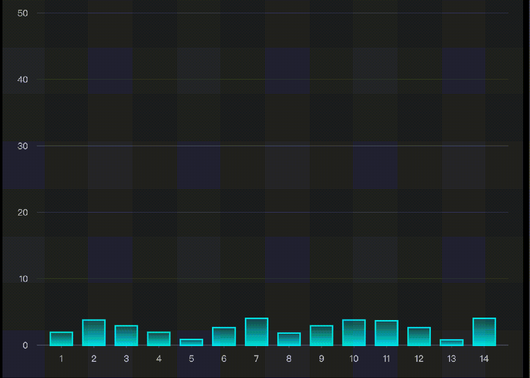 animationNormal: { bar: [ { loop: true, startTime: 100, oneByOne: 100, timeSlices: [ { delay: 1000, effects: { channel: { fillOpacity: { to: 0.5 } }, easing: "linear" }, duration: 500 }, { effects: { channel: { fillOpacity: { to: 1 } }, easing: "linear" }, duration: 500 } ] } ]}柱图氛围动画