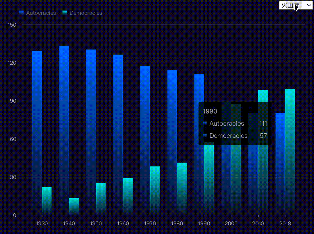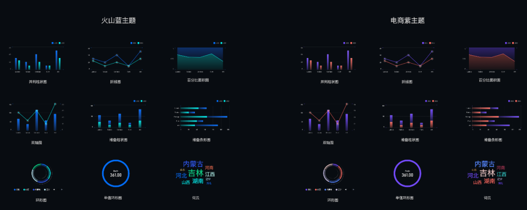const response = await fetch('https://lf9-dp-fe-cms-tos.byteorg.com/obj/bit-cloud/theme.json');const colorTheme = await response.json();// 注册主题const theme = {};for (const colorKey in colorTheme) { const colorName = colorTheme[colorKey].name; theme[colorName] = { colorScheme: { default: colorTheme[colorKey].colors } }; VChart.ThemeManager.registerTheme(colorKey, theme[colorName]);}// 主题切换VChart.ThemeManager.setCurrentTheme('volcanoBlue');在线示例:_https://www.visactor.io/vchart/guide/tutorial_docs/Theme/Customize_Theme_