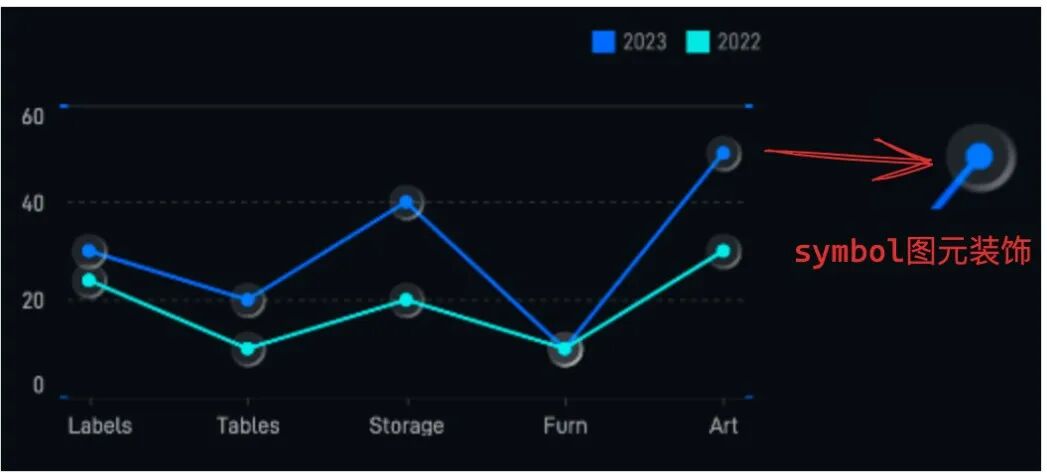 由于装饰的位置强依赖于图元,在大屏侧无法准确定位并添加。通过 VChart 提供拓展 Mark[1] 配置能力可以直接渲染出依附于既有图元的装饰图元,完美解决这一问题。