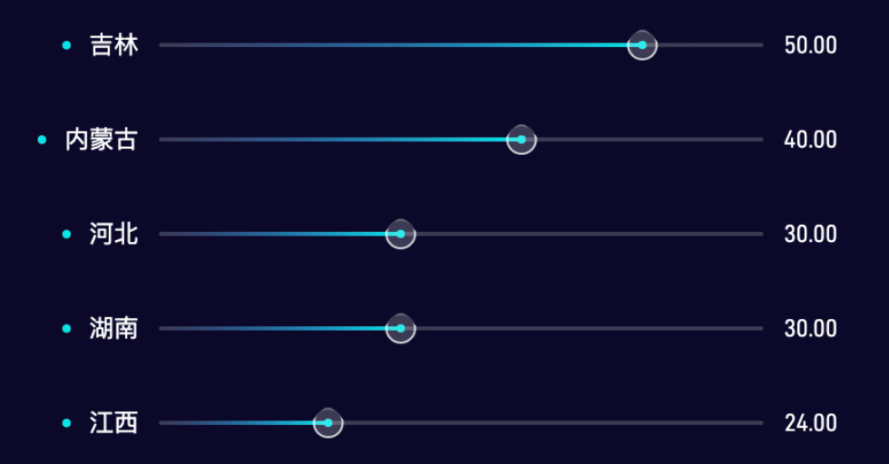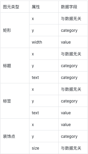 const data = [ { category: '吉林', value: 50 }, { category: '内蒙古', value: 40 }, { category: '河北', value: 30 }, { category: '湖南', value: 30 }, { category: '江西', value: 24 },]图元及数据与数据的映射关系: