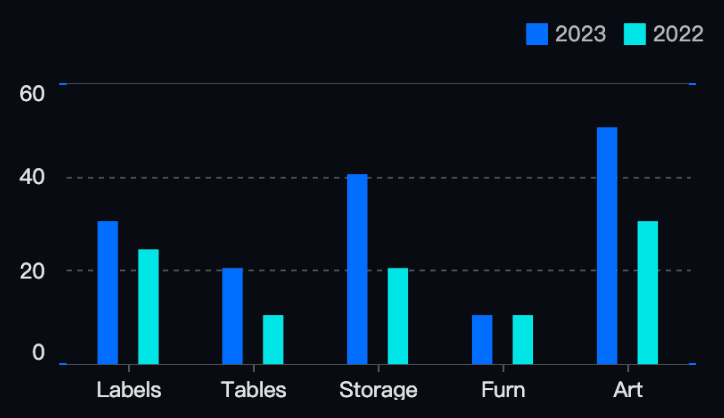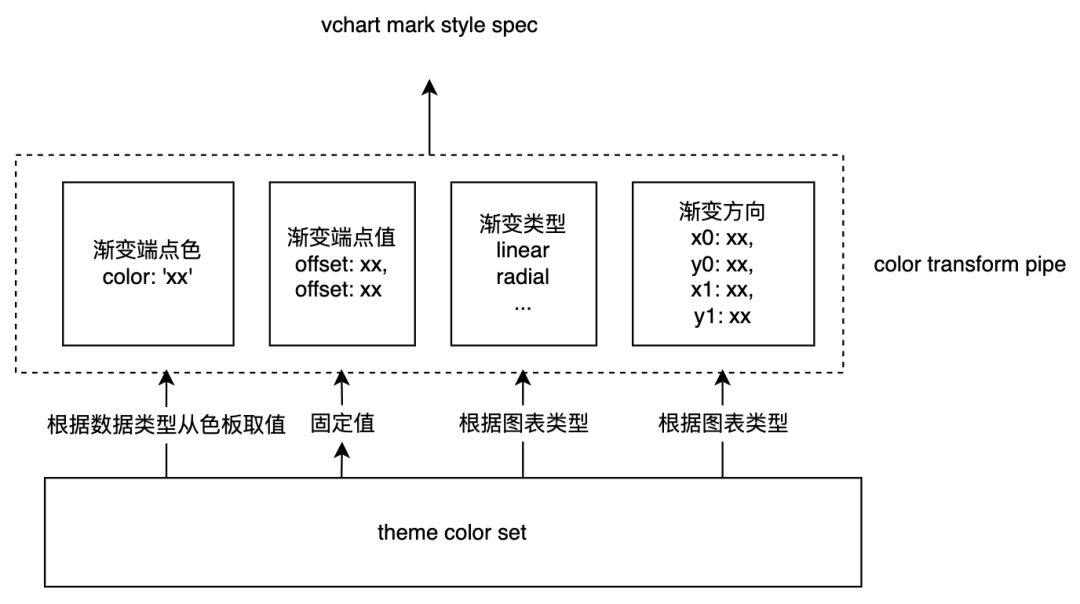 const gradientCallback = (datum, ctx, type) => { return { gradient: "linear", x0: 0, y0: 0, x1: 0, y1: 1, stops: [ { offset: 0, fillOpacity: 0, color: hexToRgba(ctx.seriesColor(datum.type), 1), }, { offset: 1, fillOpacity: 1, color: hexToRgba(ctx.seriesColor(datum.type), 0), } ] };};// 以同样的方式在主题中注册和切换const theme = { series: { bar: { bar: { style: { fill: (datum, ctx) => gradientCallback(datum, ctx, "fill"), stroke: (datum, ctx) => gradientCallback(datum, ctx, "stroke"), lineWidth: 2 } } } }}VChart.ThemeManager.registerTheme(theme, 'gradient');VChart.ThemeManager.setCurrentTheme('gradient');渐变色详细说明参考:_https://www.visactor.io/vchart/guide/tutorial_docs/Chart_Concepts/Series/Mark_