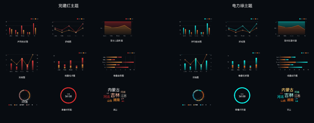 主题色板的构造基于于语义化及美观设计原则,即结合使用场景(保证大屏主题的场景表现力)、配色公式(保证图元在美观度、差异度等方面的配色效果和信息表达力)等逻辑进行设计。而针对大屏业务场景,我们沉淀出一套色彩方案,涵盖党建、金融、科技、文旅等行业,结合 VChart 主题注册和切换能力,做到开箱即用。
