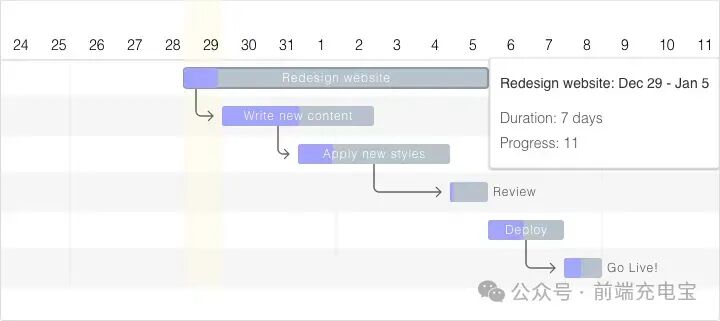 Frappe Gantt 是一个用于生成甘特图的 JavaScript 库,支持交互式绘制、拖拽、缩放、任务依赖关系和时间刻度等功能。**Github:**https://github.com/frappe/gantt