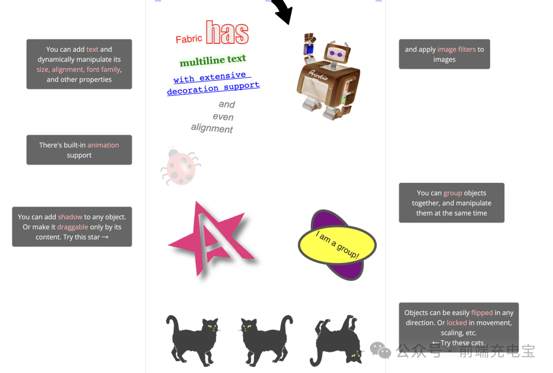 Fabric.js 是一个开源的 JavaScript 图形库,用于在 HTML5 Canvas 上进行交互式的对象模型操作和渲染。它简化了在 Canvas 上绘制图形、文本、图像和其他视觉元素的过程,并提供了丰富的交互功能,如选择、拖动、缩放、旋转等。**Github:**https://github.com/fabricjs/fabric.js
