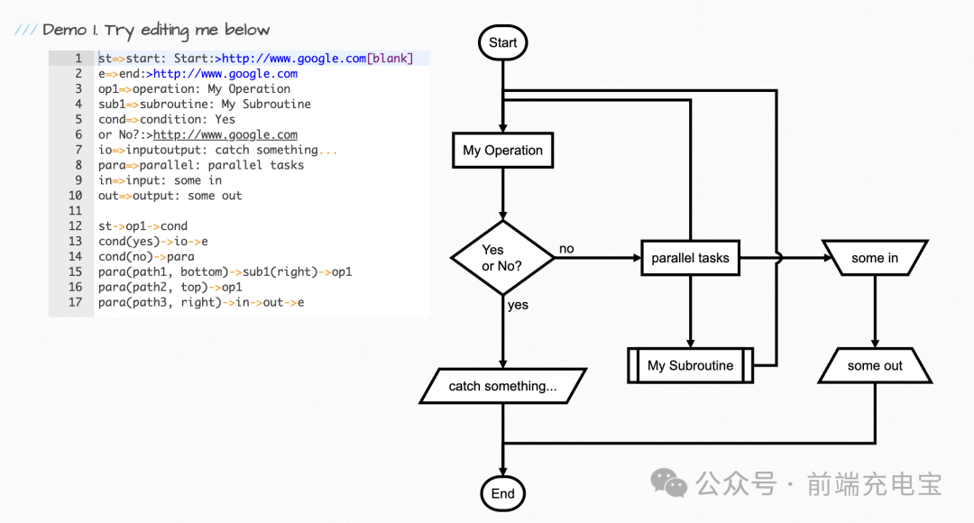 Flowchart.js 是一个基于 JavaScript 的开源库,用于在网页上绘制流程图。它允许开发者通过简单的文本描述来定义流程图的结构,然后将这些描述转换为 SVG 格式的图形。**Github:**https://github.com/adrai/flowchart.js