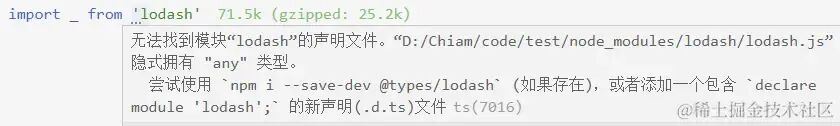 我们需要引用它的声明文件,才能获得对应的代码补全、接口提示等功能。提示里已经告诉了我们解决办法,就是去安装 @types/lodash:pnpm add -D @types/lodash,之后就能在 ts 文件中正常使用 lodash 了。