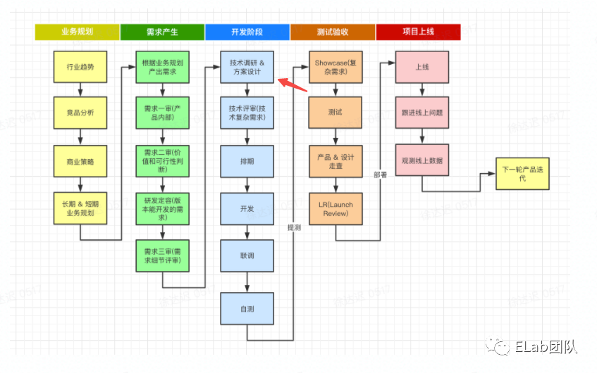 在笔者所在的前端研发流程中, 【技术调研及方案设计】属于连接【需求阶段】和【开发阶段】的中间节点。在需求详评 (三审) 后了, 需求的功能和交互已经基本确定, 而在实际进入开发之前, 还有一些 待确定的技术要点需要补全, 这些要点包括: