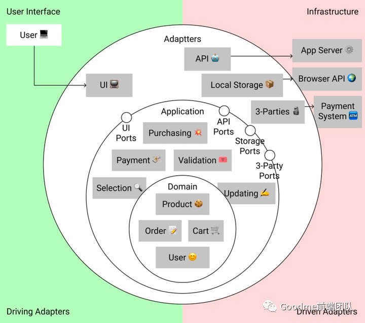 用户最常与驱动型适配器进行交互。例如,UI 框架对按钮点击的处理就是一个驱动型适配器的工作。它与浏览器的 API(第三方服务)一起工作,并将事件转换为我们的应用程序可以理解的信号。