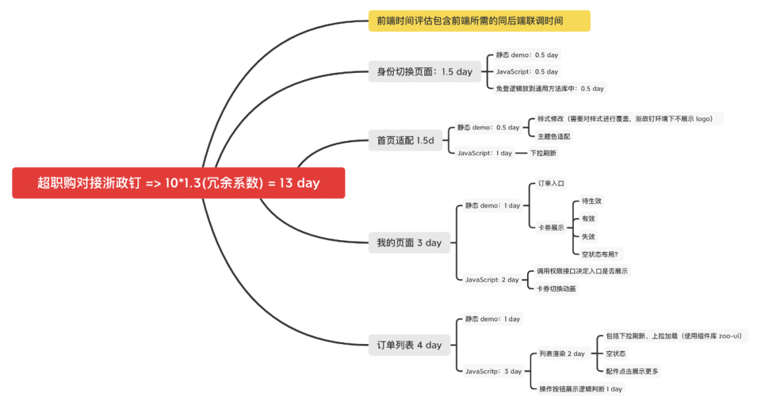 时间评估的时候,像下图一样,本地花点时间列一下 —— 这样的好处是一便于统计和比对,看有无遗漏;二评估出的时间,给到业务方、PM 等,会对我们有职业化上的认可——会认为这样的评估粒度,时间是准确的你这个人是靠谱的;另外,细粒度的维度,也便于业务方寻找需求最长路径,看需求或者走迭代也方便做出判断。