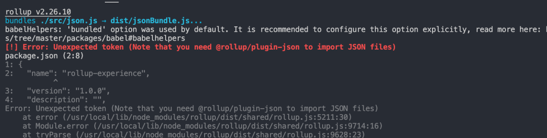import resolve from "@rollup/plugin-node-resolve";import commonjs from "@rollup/plugin-commonjs";import babel from "@rollup/plugin-babel";export default { input: ["./src/json.js"], output: { file: "./dist/jsonBundle.js", format: "umd", name: "experience", }, plugins: [resolve(), commonjs(), babel()], external: ["the-answer"],};执行打包,发现会发生如下报错:提示我们缺少