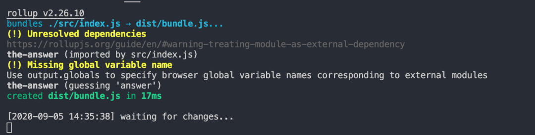 import resolve from "@rollup/plugin-node-resolve";import commonjs from "@rollup/plugin-commonjs";import babel from "@rollup/plugin-babel";export default { input: ["./src/es6.js"], output: { file: "./dist/esBundle.js", format: "umd", name: "experience", }, plugins: [resolve(), commonjs(), babel()], external: ["the-answer"],};然后打包,发现会出现报错:提示我们缺少