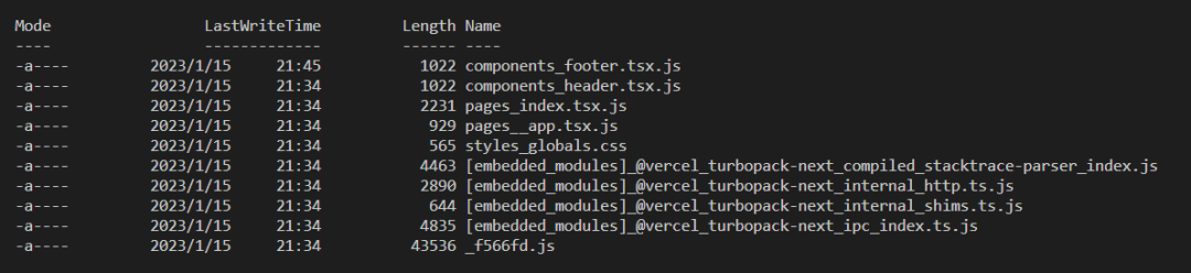 import Header from '../components/header'import Footer from '../components/footer'export default function Home() { return ( <div> <Header /> <h1>Home</h1> <Footer /> </div> )}当页面访问 /home 时 Header 和 Footer 会被标记为需要缓存 ,并被编译输出为 components_header.tsx.js 和 components_footer.tsx.js。而后更新 Footer 这个组件并保存,在 Webpack 中 Header 和 Footer 两个组件都会被重新编译,而仔细观察 Turbopack 输出的缓存文件,会发现只有 Footer 组件被重新编译,而 Header 组件则使用的是上一次的编译结果,如图所示 compoents_footer.tsx.js 的文件被刷新,而 header 则依旧是上一次的结果。
