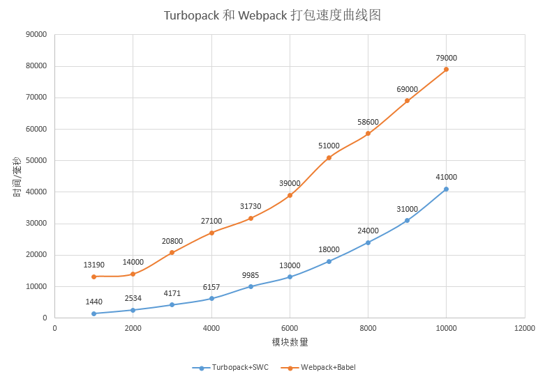 node batch.js 1000后面的数字为生成的模块数量,代码生成完成后将 page.tsx 引入并重启服务。分别生成 1000 ~ 10000 个模块的页面,并使用 Turbopack 运行, 记录多次编译所需的平均时间。作为参照使用 Webpack + Babel 的打包速度作为对比,操作方法同上。 得到以下曲线图: