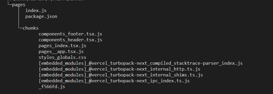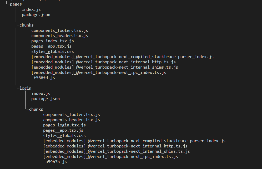 import Header from '../components/header'import Footer from '../components/footer'export default function Login() { return ( <div> <Header /> <h1>Login</h1> <Footer /> </div> )}启动项目,在不到 1s 时间后控制台提示已经启动成功,但是文件目录下却没有输出任何缓存文件,这是由于 Turbopack 的按需编译机制,所有组件在启动时都未被使用,所以没有任何的编译操作。在浏览器中访问项目的首页地址,此时观察输出缓存文件则发现 /home 页面及其依赖的组件才被编译:
