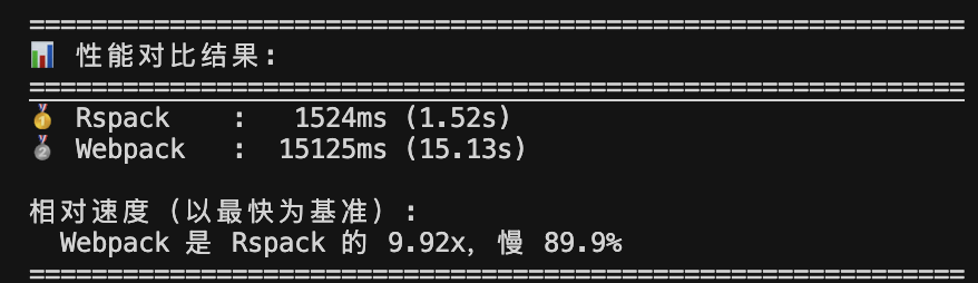 测试项目打包速度对比结果:同一套项目代码(大概 400 个小文件) + 配置;webpack 采用了 babel,rspack 采用了内置的 SWC(仅是测试代码测试,仅做参考)