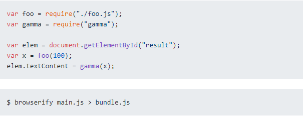 browserify致力于在浏览器端使用CommonJs,他使用跟 NodeJs 一样的模块化语法,然后将所有依赖文件编译到一个bundle文件,在浏览器通过<script>标签使用的,并且支持 npm 库。