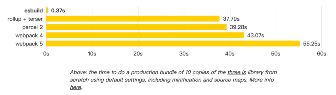 上面多次提到了esbuild,esbuild使用 go 语言编写,所以在 i/o 和运算运行速度上比解释性语言 NodeJs 快得多,esbuild 号称速度是 node 写的其他工具的 10~100 倍。