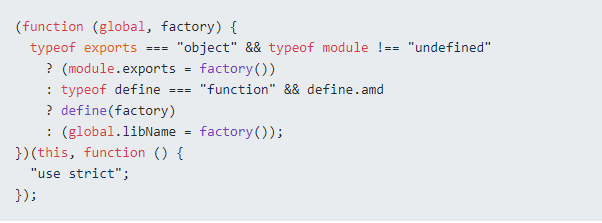 现在有了RequireJs,也有了browserify但是这两个用的是不同的模块化规范,所以有了 UMD - 通用模块规范,UMD 规范就是为了兼容AMD和CommonJS规范。就是以下这坨东西:
