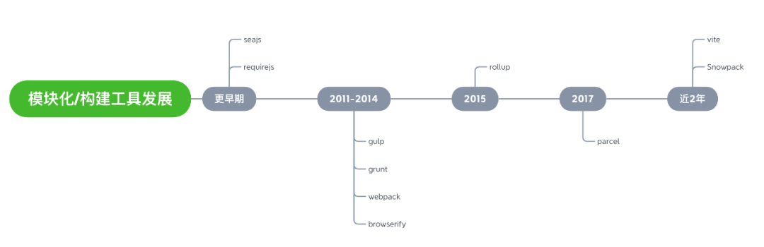 前端模块化 / 构建工具从最开始的基于浏览器运行时加载的 RequireJs/Sea.js 到将所有资源组装依赖打包 webpack/rollup/parcel的bundle类模块化构建工具,再到现在的bundleless基于浏览器原生 ES 模块的 snowpack/vite,前端的模块化 / 构建工具发展到现在已经快 10 年了。
