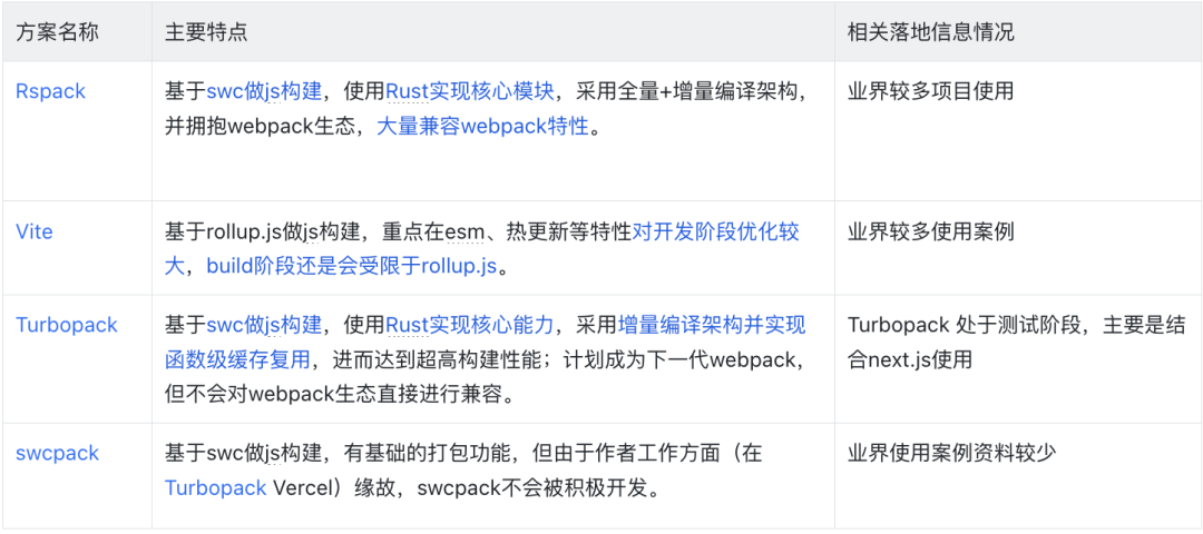 既然是业界的普遍性问题,那么外界也肯定会存在不少优化案例可以借鉴或者复用。由于 Node.js 的优化方案通常都会存在各种场景限制,这里我们主要从另外一个思路去寻找方案。经过调研目前业界的主要方案有 Rspack、Vite、Turbopack、swcpack 相对比较有代表性(可能还有其他方案,由于笔者时间精力有限未能了解到)。几个方案主要的情况如下(笔者个人主观分析,仅供参考):