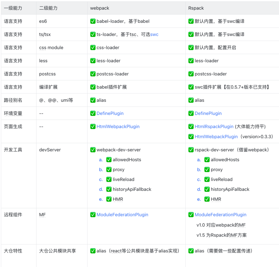 低成本:Rspack 大量兼容 webpack 生态,大量配置和插件可以直接或者调整一下配置即可复用,仅需对一些特殊的插件自研定制开发即可。以下是对项目主要使用到的 webpack 能力进行了梳理,并对其在 Rspack 中的情况情况也进行了对照。