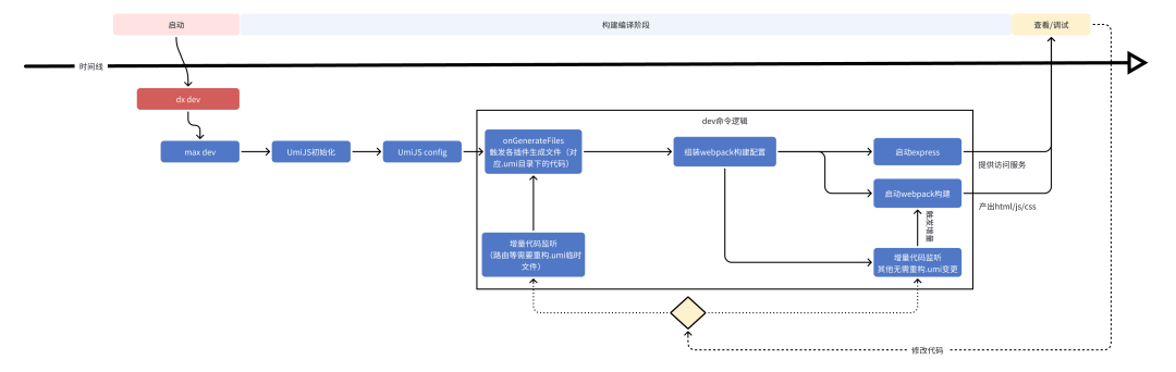 通过查看 UmiJS 项目的源码,发现其内部的构建实现全部集中在 dev/build 这两个扩展命令中。源代码在 preset-umi/src/commands / 目录下的 dev/dev.ts 和 build.ts 两个文件,分别对应 dev 和 build 命令。而实际上的构建逻辑,实现上主要是在 @umijs/bundler-vite 和 @umijs/bundler-webpack 两个包中。其内部执行的主要逻辑如下(这里以 dev 模式为例,build 模式基本上类似,就是少了文件监听编译和 express 相关逻辑):